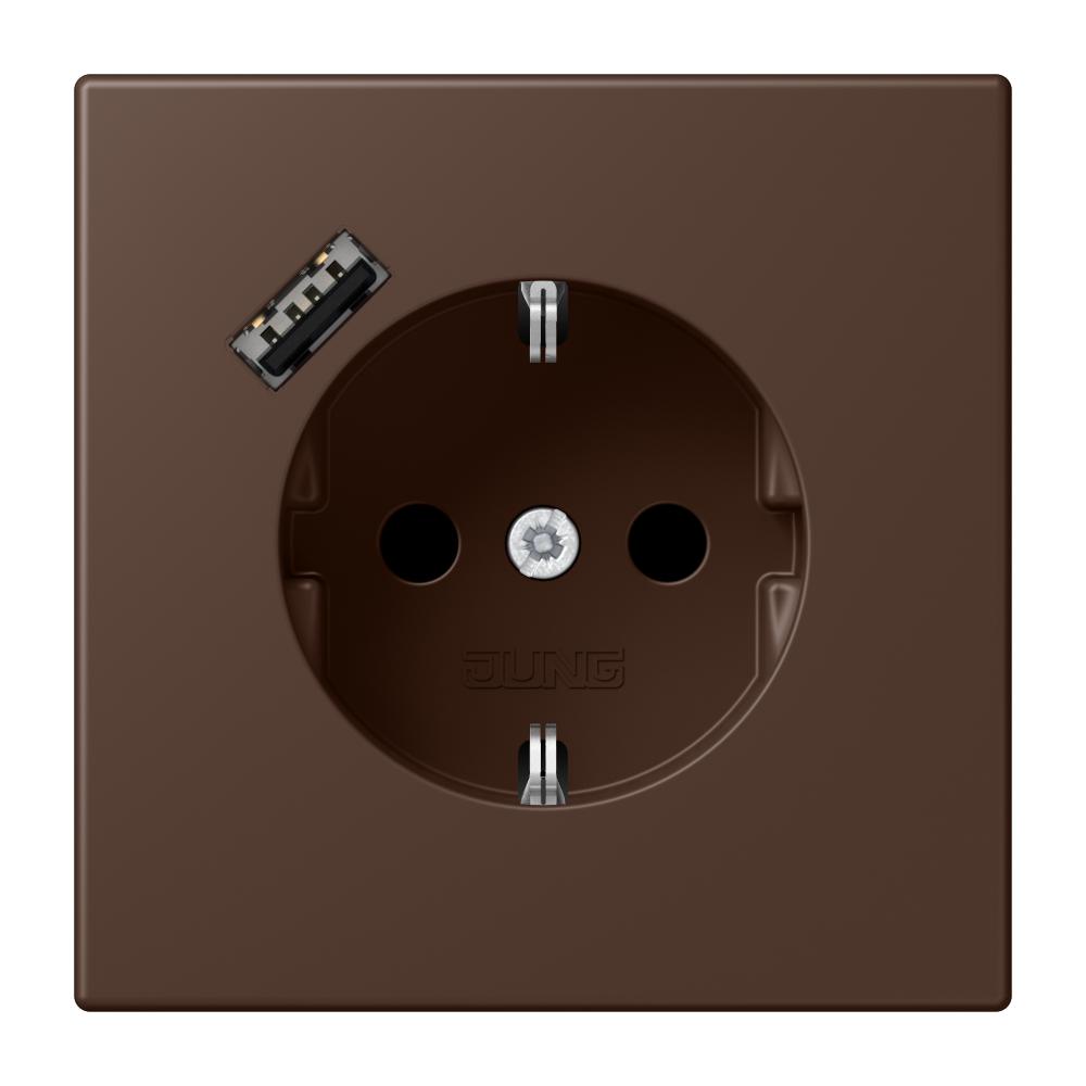 Tomada SCHUKO®, 16 A 250 V ~, com carregador USB (JUNG Quick Charge®), 1 x tipo A, Safety Plus, Série LS, terre d’ombre brûlée 31 (32130)